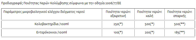 Οι προδιαγραφές της Ποιότητας των Νερών Κολύμβησης, με βάση τη συγκέντρωση των κολοβακτηριδίων και του εντερόκοκκου, σύμφωνα με την Ευρωπαϊκή Οδηγία 2006/77: