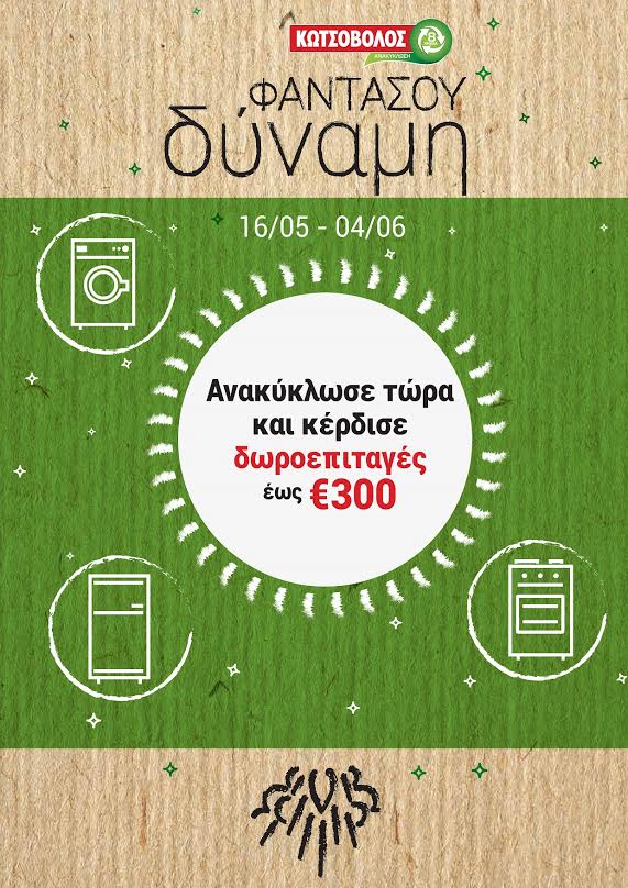 Ένα νέο πρόγραμμα ανακύκλωσης ηλεκτρικών συσκευών ξεκινά αυτή την εβδομάδα σε όλο το δίκτυο της Κωτσόβολος, αλλά και στο ηλεκτρονικό κατάστημα www.kotsovolos.gr, γεμάτο μοναδικές ευκαιρίες και οφέλη, τόσο για τους καταναλωτές, όσο και για το περιβάλλον! Η Κωτσόβολος κάνει για 8η συνεχόμενη χρονιά πράξη αυτή την «πράσινη πρωτοβουλία», υποστηρίζοντας και διαδίδοντας τη σημασία της ανακύκλωσης, ενώ ταυτόχρονα δίνει ακόμα περισσότερα κίνητρα στους καταναλωτές για να ανακυκλώσουν τις παλιές ενεργοβόρες συσκευές τους.