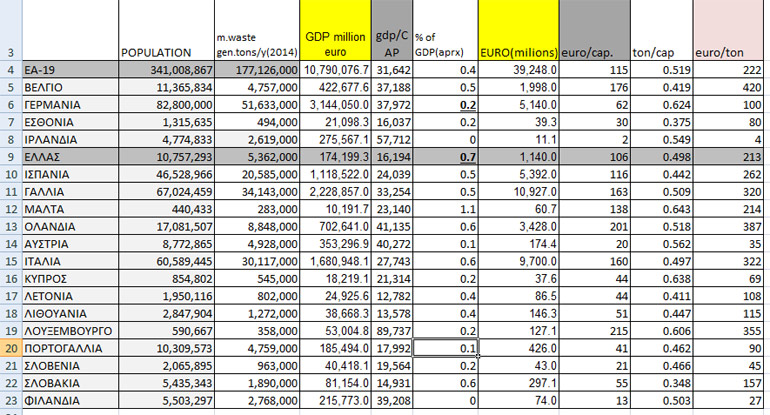 Τα στοιχεία είναι χαρακτηριστικά: Σύμφωνα με τη Eurostat, η διαχείριση των απορριμμάτων κοστίζει στη χώρα μας 1,14 δις ετησίως, δηλαδή το 0,7% του ΑΕΠ, ποσό τριπλάσιο σε σχέση με τον ευρωπαϊκό μέσο όρο, με το κόστος ανά τόνο να ανέρχεται στα 213 ευρώ τον τόνο. Ενδεικτικά, στην Αυστρία το αντίστοιχο κόστος είναι 35 ευρώ και στη Γερμανία 80 ευρώ.