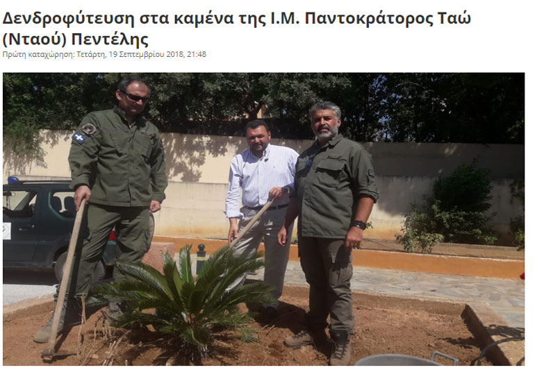 Πραγματοποιήθηκε σήμερα 18 Οκτωβρίου με πρωτοβουλία του Προέδρου της Δ’ Κυνηγετικής Ομοσπονδίας Στερεάς Ελλάδας κου Νίκου Σταθόπουλου και του Ομοσπονδιακού Θηροφύλακα κου Ρωμανού Ευάγγελου, η 2η δενδροφύτευση και πότισμα στα καμένα του χώρου της Ιεράς Μονής Παντοκράτορος Ταώ (Νταού) Πεντέλης.