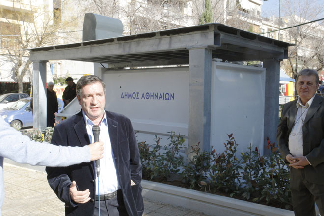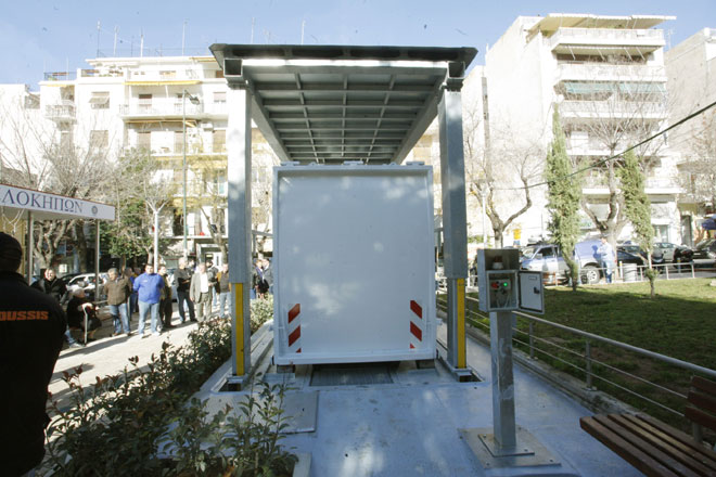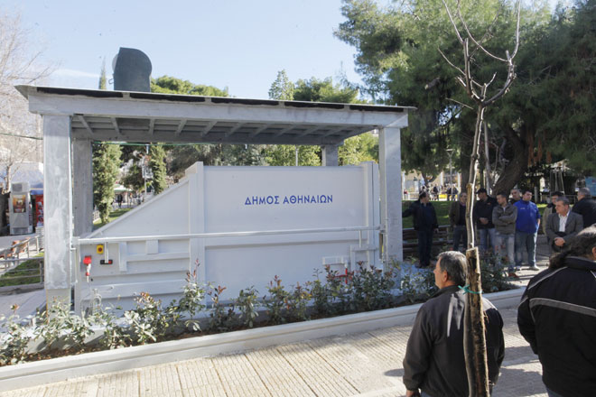 Στην πλατεία του Αγίου Θωμά στο Γουδί εγκαινιάστηκε σήμερα ο πρώτος από τους 20 βυθιζόμενους κάδους που συνολικά θα τοποθετηθούν στην Αθήνα.