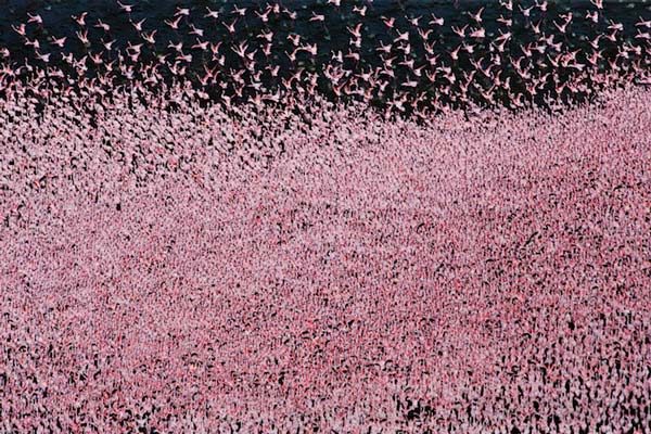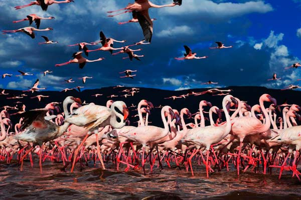 Δεκάδες χιλιάδες πανέμορφα φλαμίνγκο πετούν καθημερινά στον ουρανό, δίνοντάς του έτσι ένα φωτεινό ροζ χρώμα, συνθέτοντας εν τέλει ένα μοναδικό τοπίο.