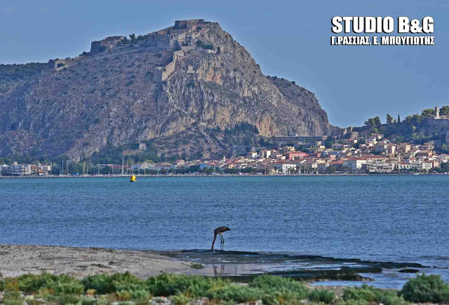Ένα μοναχικό φλαμίνγκο εντόπισε ο φωτογραφικός φακός των Αργολικών Ειδήσεων στον υδροβιότοπο Ναυπλίου Νέας Κίου σήμερα, Δευτέρα.
