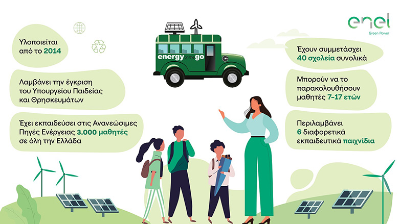 Το καινοτόμο πρόγραμμα «Energy on the Go» της Enel Green Power Hellas, το οποίο έχει λάβει έγκριση από το Υπουργείο Παιδείας και Θρησκευμάτων, ολοκληρώθηκε για ακόμη μια εκπαιδευτική χρονιά με επιτυχία. Περίπου 600 παιδιά και νέοι από Αθήνα, Θεσσαλονίκη και Κομοτηνή είχαν την ευκαιρία – τη σχολική χρονιά 2022-2023 – να συμμετέχουν και να γνωρίσουν με βιωματικό και διασκεδαστικό τρόπο τον κόσμο της πράσινης ενέργειας και της κυκλικής οικονομίας, αλλά και να ευαισθητοποιηθούν σε περιβαλλοντικά θέματα. Από το 2014 έως και φέτος, συνολικά περισσότεροι από 3.000 νέοι έχουν παρακολουθήσει το πρόγραμμα.
