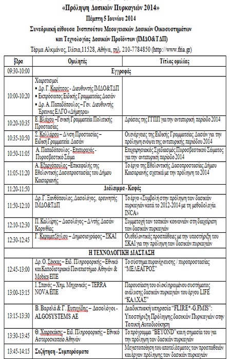 Tο Ινστιτούτο Μεσογειακών Δασικών Οικοσυστημάτων και Τεχνολογίας Δασικών Προϊόντων, στα πλαίσια του χρηματοδοτούμενου από την Ειδική Γραμματεία Δασών μέσω του Ειδικού Φορέα Δασών του Πράσινου Ταμείου του Υ.ΠΕ.Κ.Α. έργου με τίτλο «Συμβολή στην πρόληψη των δασικών πυρκαγιών κατά το 2012-2014 με τη μεθοδολογία INCA», διοργανώνει ημερίδα με θέμα «ΠΡΟΛΗΨΗ ΔΑΣΙΚΩΝ ΠΥΡΚΑΓΙΩΝ 2014» στη συνεδριακή αίθουσα του Ινστιτούτου την Πέμπτη, 05 Ιουνίου 2014, με ώρα έναρξης τις 09:30 και ολοκλήρωσης τις 14:15.