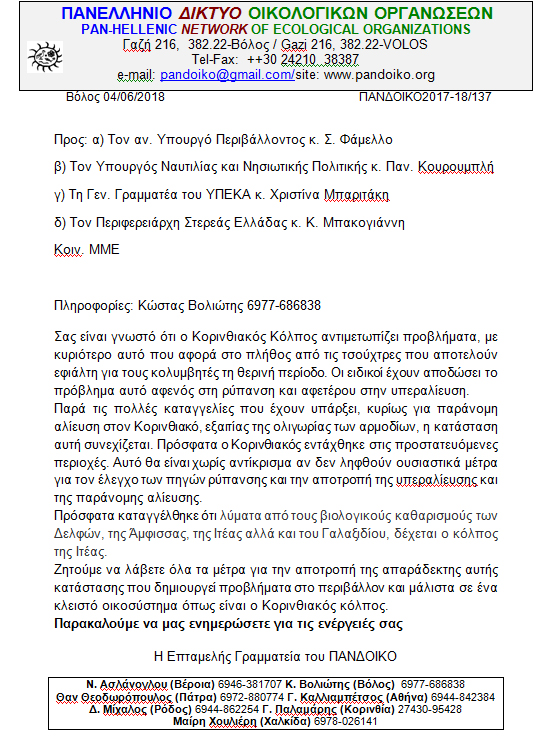 Επιστολή προς τους αρμόδιους φορείς, σχετικά με το οικολογικό έγκλημα που αποκαλύφθηκε στην Ιτέα, έστειλε το Πανελλήνιο Δίκτυο Οικολογικών Οργανώσεων. Το ΠΑΝΔΟΙΚΟ ζητά να ενημερωθεί για το τι ακριβώς συμβαίνει στην περιοχή, ενώ ζητά ενημέρωση και για το τι ενέργειες έχουν γίνει.