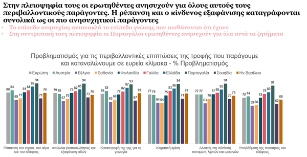 Σύμφωνα με τη συγκεκριμένη έρευνα, οι Έλληνες πιστεύουν σε μεγαλύτερο βαθμό από τον ευρωπαϊκό μέσο όρο (56%, έναντι 52%) ότι ο τρόπος παραγωγής και κατανάλωσης τροφής έχει αρνητικές επιπτώσεις στο περιβάλλον και ανησυχούν σοβαρά για αυτές, αν και μόλις ένας στους τρεις αναλογίζεται πραγματικά με ποιον τρόπο οι ατομικές μας διατροφικές επιλογές επηρεάζουν τον πλανήτη. Παρ’ όλα αυτά, μέσα από την έρευνα προκύπτει πως οι Έλληνες καταναλωτές εμφανίζονται διατεθειμένοι να ακολουθήσουν ένα μοντέλο διατροφής φιλικό προς τον πλανήτη, όμως πρακτικά δεν ξέρουν πώς να το κάνουν. Επιπλέον, αν και σε ποσοστό 70% δηλώνουν πρόθυμοι να αλλάξουν συνήθειες προς το καλύτερο, αναφέρουν πως το οικονομικό κόστος είναι ο κύριος αποτρεπτικός παράγοντας.