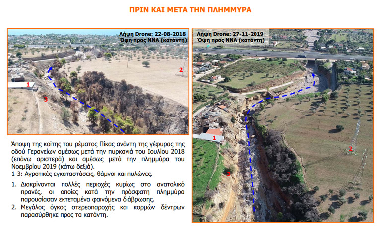 1. Η πυρκαγιά του 2018 αναμφίβολα συνετέλεσε στη δραματική αύξηση των φερτών υλικών. Η έντονη παρουσία φερτών υλικών: (α) αύξησε τον όγκο των υδάτων και (β) μείωσε τις διατομές του ρέματος Πίκας.