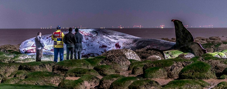 Μία φάλαινα μήκους 14 μέτρων εκβράστηκε νεκρή με τραύματα στην περιοχή Norfolk του Ηνωμένου Βασιλείου, προκαλώντας έκπληξη σε όσους έτυχε να περάσουν από την ακτή όπου κείτονταν.
