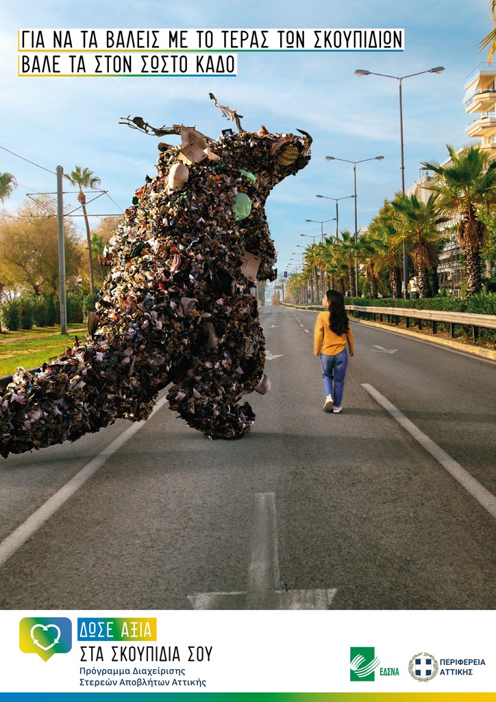 Αυτό το τέρας και την εξέλιξη του αναδεικνύει με ένα συμβολικό τρόπο, η νέα καμπάνια ευαισθητοποίησης των πολιτών για τη σωστή διαχείριση των στερεών αποβλήτων, που σχεδιάστηκε για λογαριασμό του Ειδικού Διαβαθμιδικού Συνδέσμου Νομού Αττικής (ΕΔΣΝΑ) και την Περιφέρεια Αττικής.