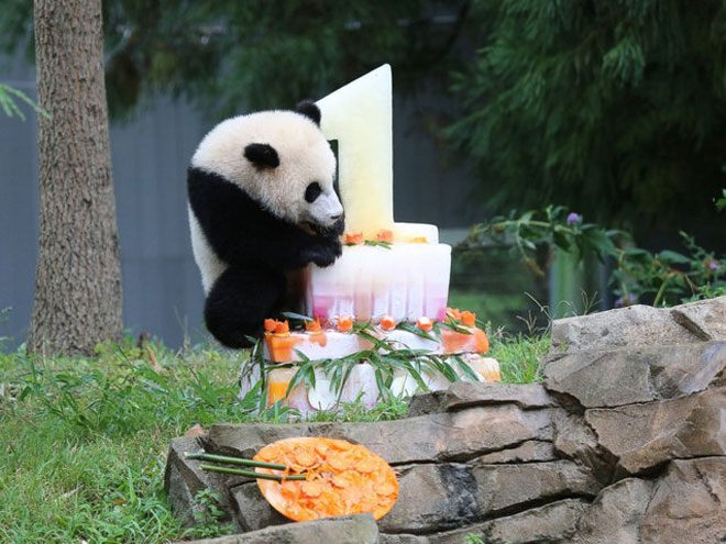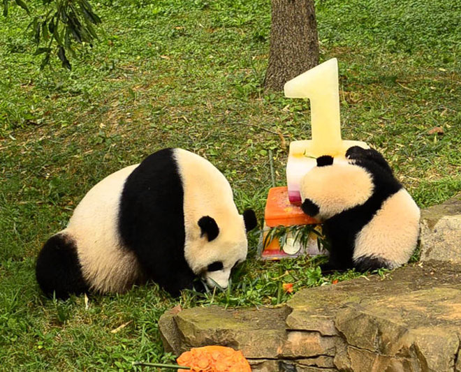 Μάλιστα, προσπάθησε να απολαύσει το κέικ με κάθε τρόπο, ανεβαίνοντας μέχρι επάνω του, ενώ η μαμά της, η Mei Xiang, έσπευσε να της… συμπαρασταθεί στο φάγωμα!
