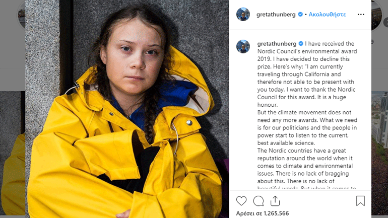 Η νεαρή ακτιβίστρια Γκρέτα Τούνμπεργκ αρνήθηκε να δεχτεί ένα βραβείο για τις περιβαλλοντικές της δράσεις, λέγοντας ότι το κίνημα για το κλίμα δεν χρειάζεται βραβεύσεις.