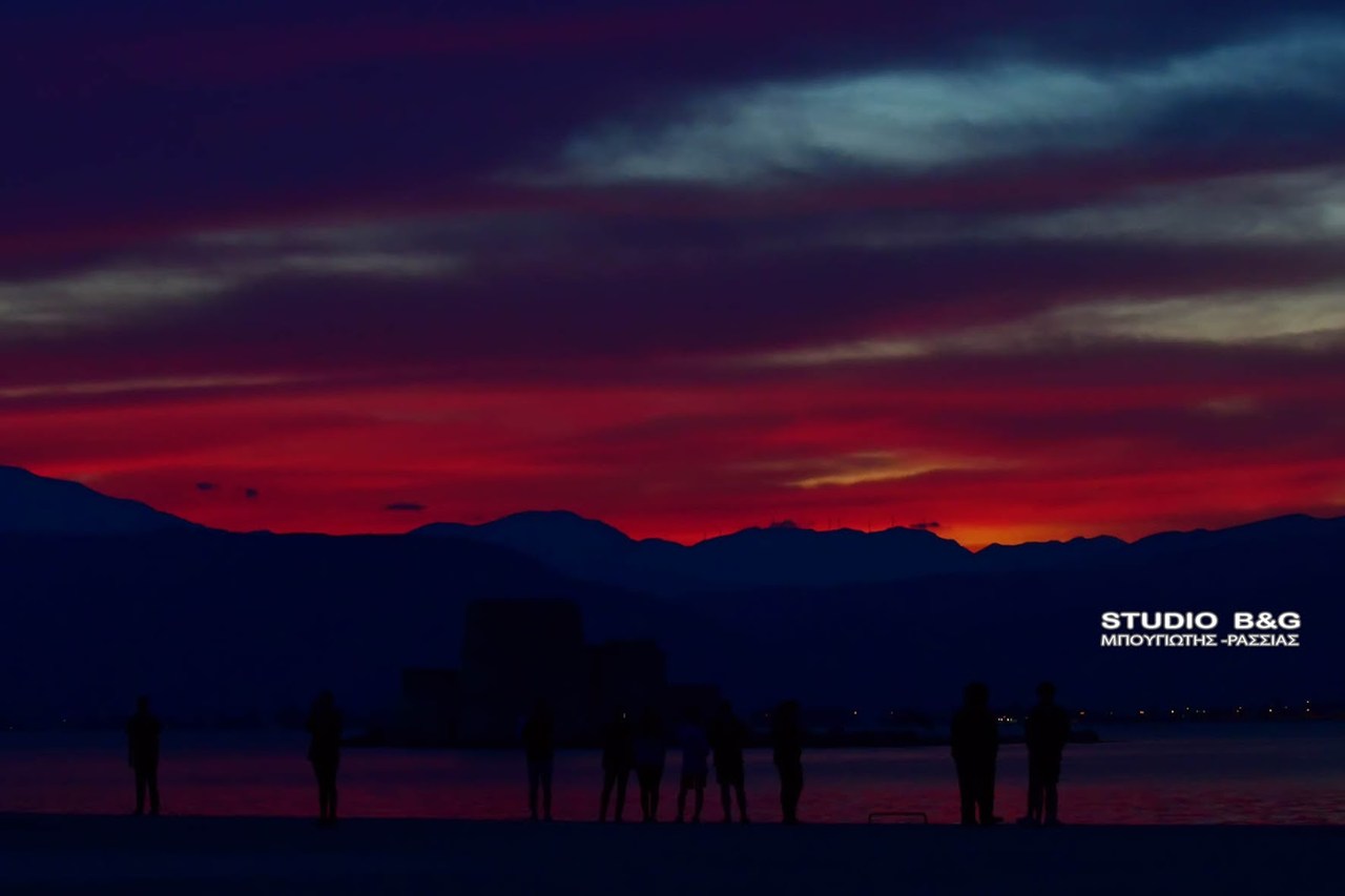 Καθώς ο ήλιος δύει και το φως δίνει σταδιακά τη θέση του στο σκοτάδι, ο ουρανός μετατρέπεται σε παλέτα χρωμάτων, σαγηνεύοντας κατοίκους και επισκέπτες στο Ναύπλιο.