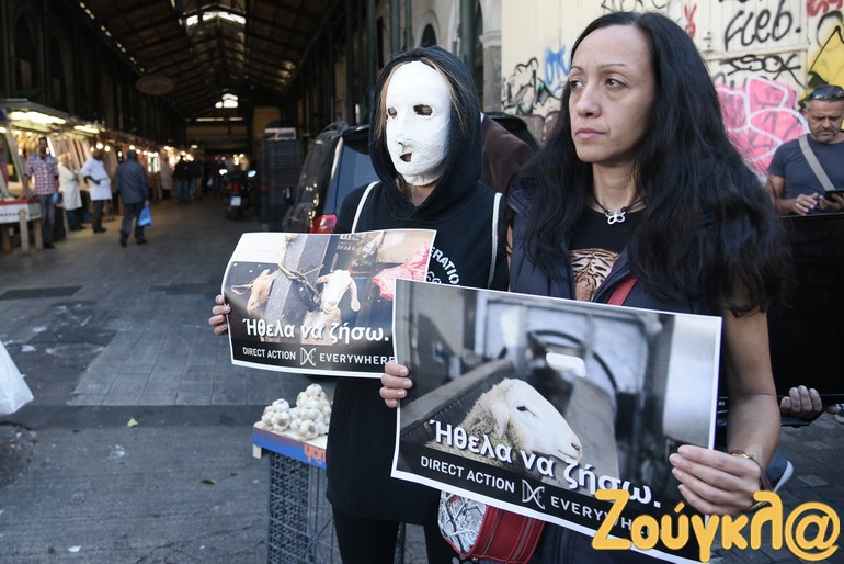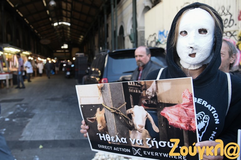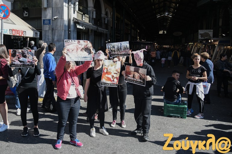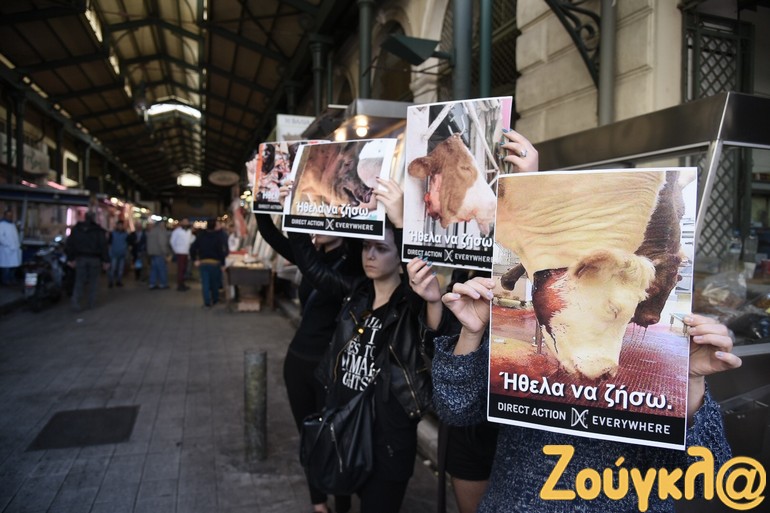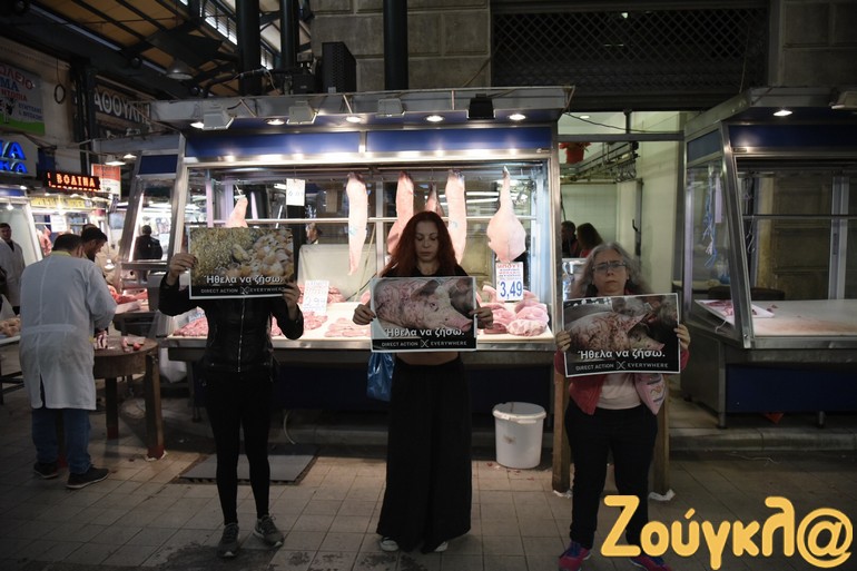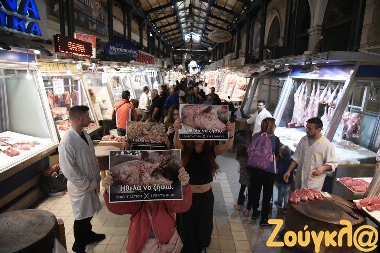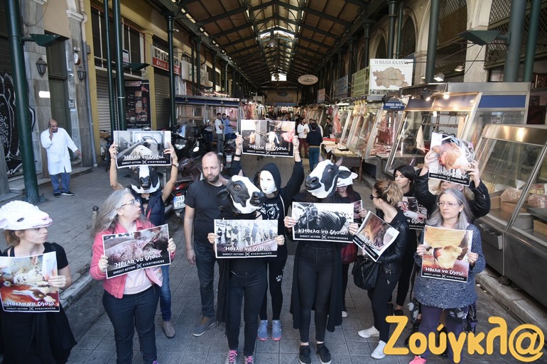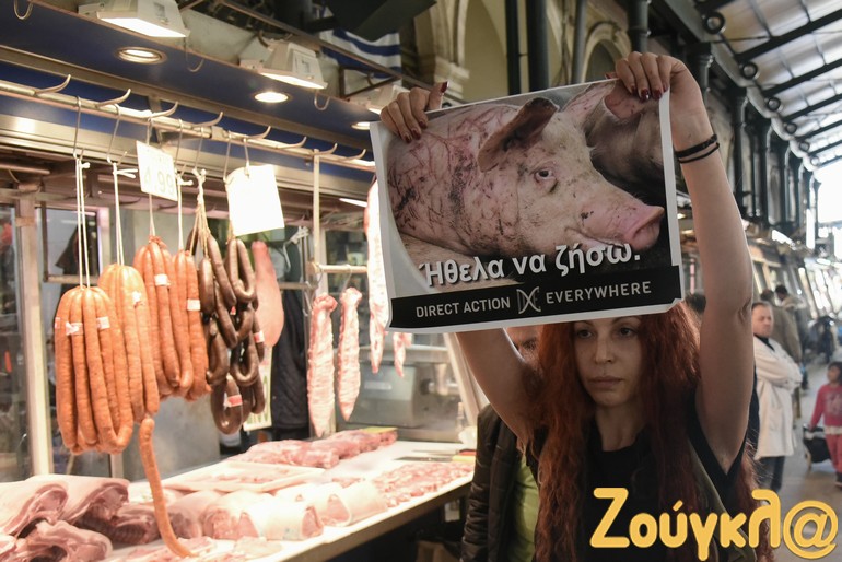 Ανάμεσα σε ωμά κρέατα κάθε είδους, και υπό τα έκπληκτα βλέμματα των κρεοπωλών και των περαστικών, περίπου 20 ακτιβιστές έδειχναν παραστατικά πώς ήταν η… μπριζόλα που αγοράζουμε, πριν από την ανθρώπινη -βάρβαρη και εγκληματική όπως υποστηρίζουν- παρέμβαση, ήταν… ζωή. Μάλιστα, τοποθέτησαν μεγάλα ηχεία στην είσοδο της αγοράς, από όπου για αρκετή ώρα ακούγονταν οι ανατριχιαστικές κραυγές των ζώων στα σφαγεία.