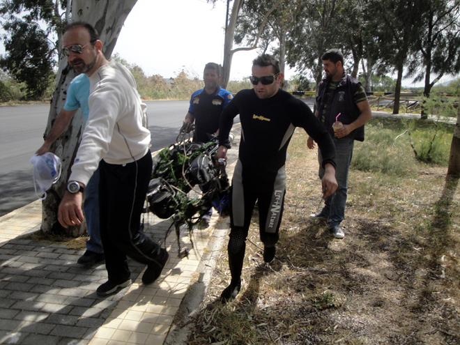Πολλές σακούλες με μπάζα και σκουπίδια, αλλά και ένα… μηχανάκι, ήταν το αποτέλεσμα μιας ακόμα προσπάθειας καθαρισμού του Αλμυρού ποταμού, στα Λινοπεράμματα.