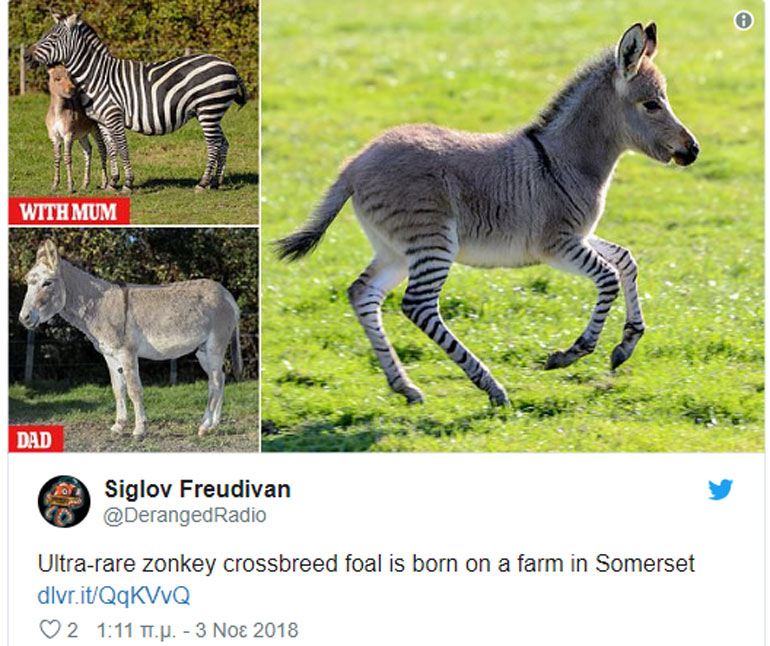 Μία σπάνια διασταύρωση ανάμεσα και σε μία ζέβρα και έναν γάιδαρο βρίσκεται πλέον σε φάρμα στο Σόμερσετ. Ο Zippy, ένα αρσενικό πουλάρι, γεννήθηκε στις 2 Οκτωβρίου και είναι το δεύτερο zonkey -όπως ονομάζουν τα ζώα που προκύπτουν από την παραπάνω διασταύρωση- που γεννήθηκε στη Βρετανία.