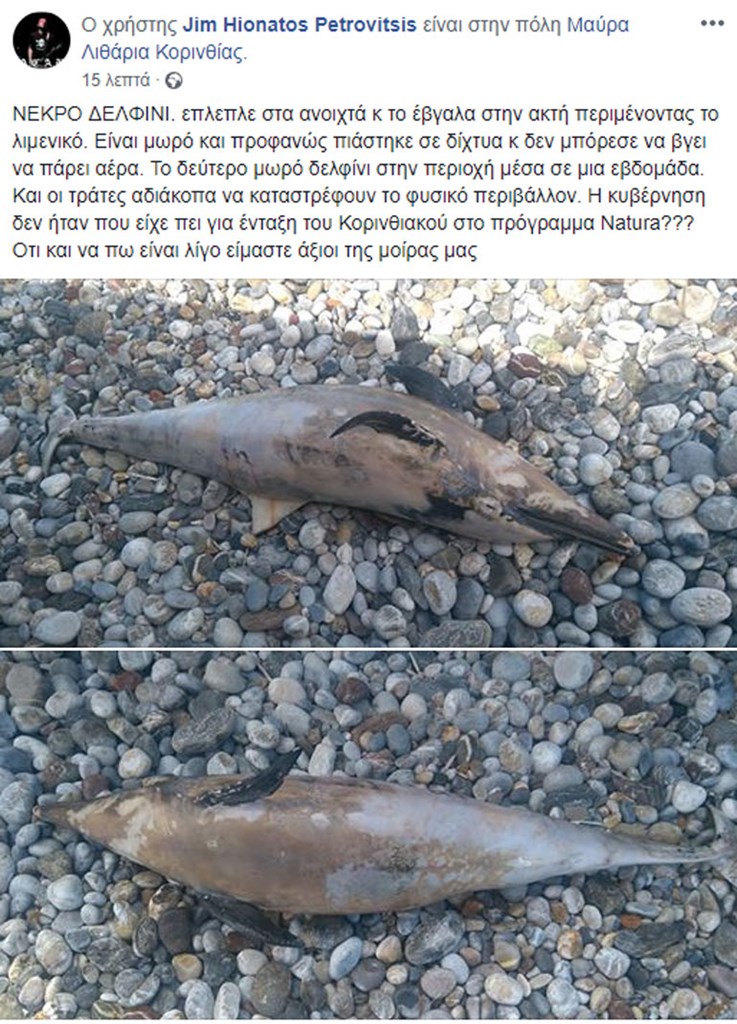 Με ένα δυσάρεστο θέαμα ήρθε αντιμέτωπος κολυμβητής, στην περιοχή Μαύρα Λιθάρια της Κορινθίας. Σε απόσταση μόλις 10 μέτρων από την ακτή, ο κολυμβητής εντόπισε ένα μωρό δελφίνι νεκρό. Αμέσως το έβγαλε στην παραλία και ειδοποίησε το λιμενικό.