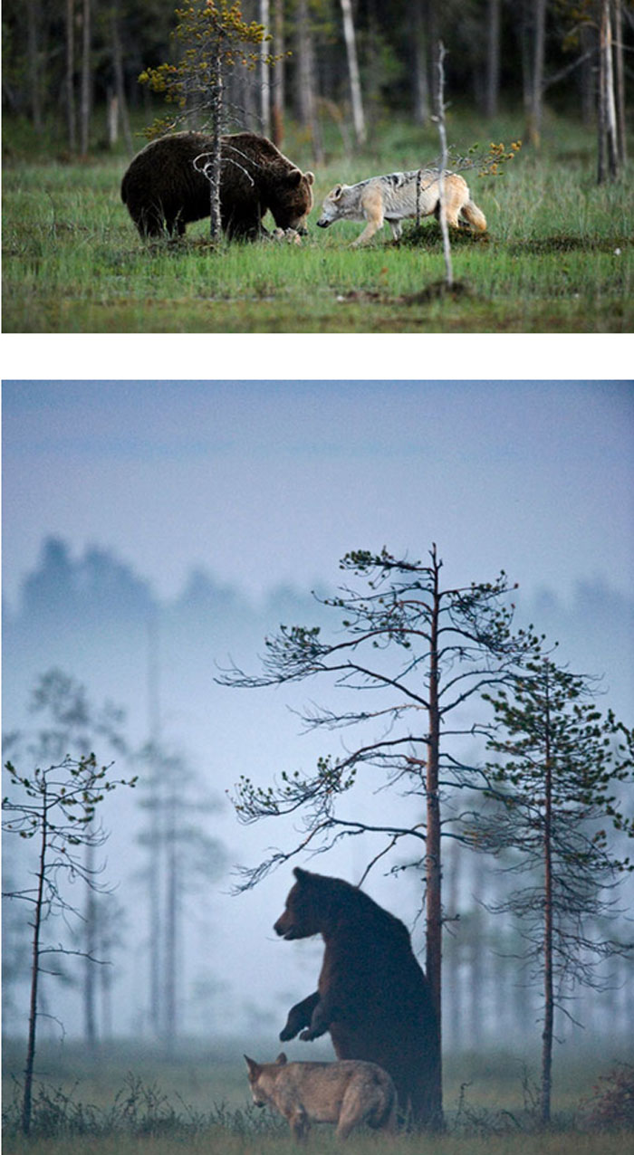 «Είναι πολύ ασυνήθιστο να δει κάποιος μια αρκούδα και έναν λύκο να κάνουν τόσο στενή παρέα», λέει η φωτογράφος από τη Φινλανδία Lassi Rautiainen. Η 56χρονη, που «συνέλαβε» με την κάμερά της αυτές τις φωτογραφίες, συνάντησε τα ζώα σε μια διαδρομή που έκανε σε δάσος της χώρας της, όπου συνάντησε αυτό το παράξενο δίδυμο.