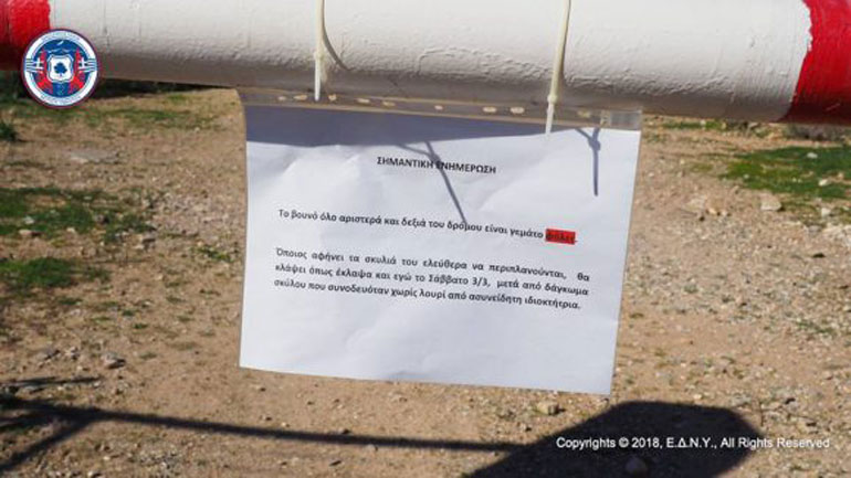 «Το βουνό όλο αριστερά και δεξιά του δρόμου είναι γεμάτο φόλες. Όποιος αφήνει τα σκυλιά του ελεύθερα να περιπλανούνται θα κλάψει όπως έκλαψα και εγώ το Σάββατο 3/3 μετά από δάγκωμα σκύλου που συνοδευόταν χωρίς λουρί από ασυνείδητη ιδιοκτήτρια».