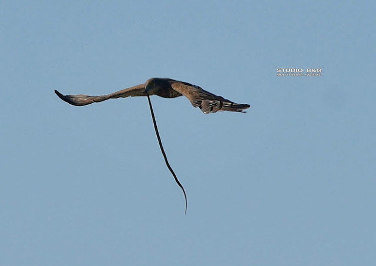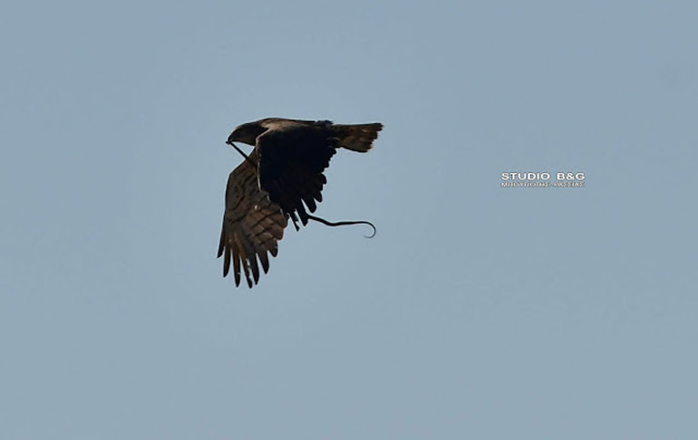 Ένας Φιδαετός πετά πάνω από τον Υδροβιότοπο Ναυπλίου Νέας Κίου κρατώντας ένα φίδι που έπιασε στην περιοχή.
