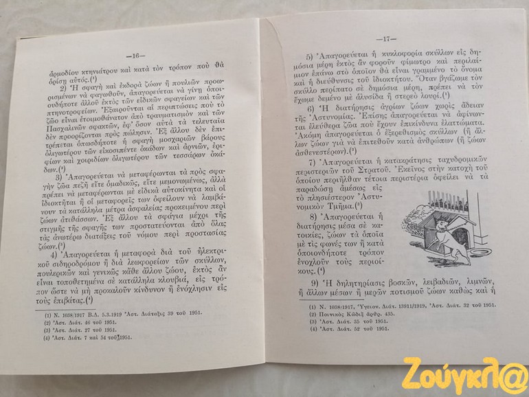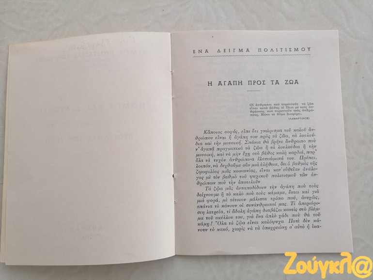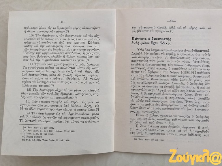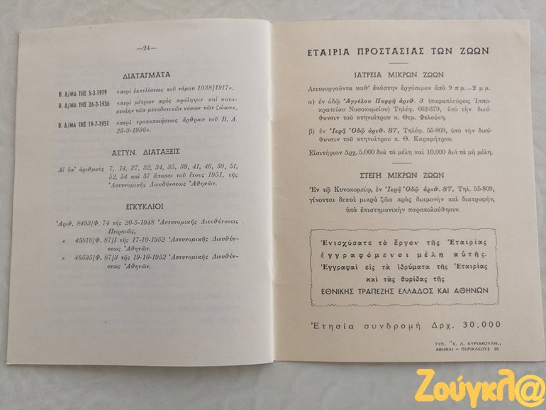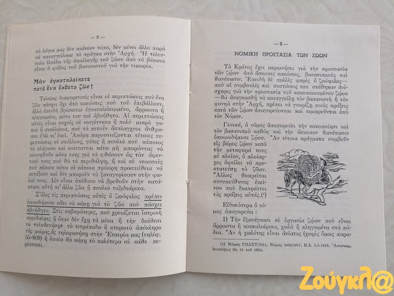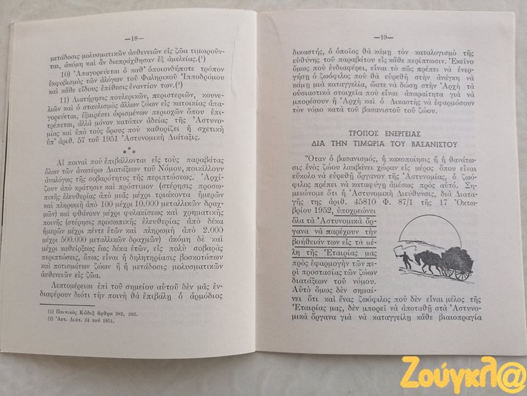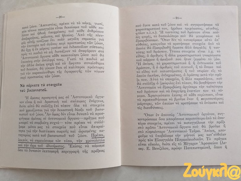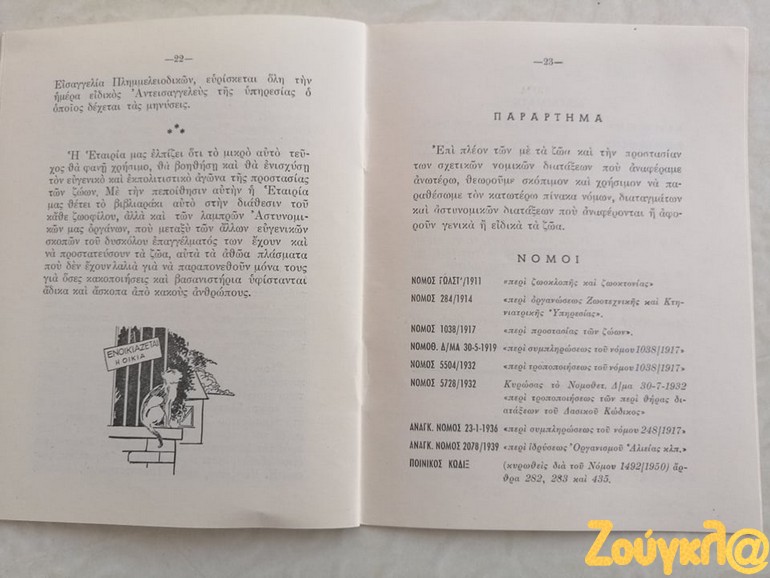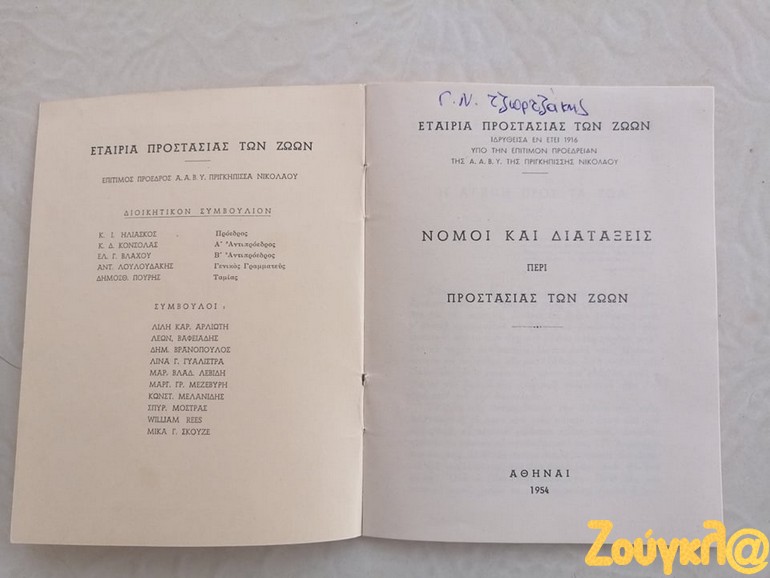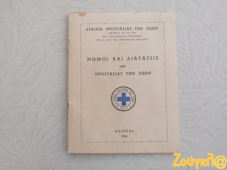 «Κατά την έρευνα που πραγματοποιώ στα πλαίσια της φοίτησης μου στο νέο Διιδριματικό Πρόγραμμα Μεταπτυχιακών Σπουδών (ΔΠΜΣ) Ζώα: Ηθική, Δίκαιο, Ευζωία διοργανώνεται από το Τμήμα Φιλοσοφίας του ΕΚΠΑ, έφτασε στα χέρια μου ένα σχετικά σπάνιο εγχειρίδιο. Το εγχειρίδιο με τίτλο « ΝΟΜΟΙ ΚΑΙ ΔΙΑΤΑΞΕΙΣ ΠΕΡΙ ΠΡΟΣΤΑΣΙΑΣ ΤΩΝ ΖΩΩΝ» έκδοση του 1954 της ΕΤΑΙΡΕΙΑΣ ΠΡΟΣΤΑΣΙΑΣ ΤΩΝ ΖΩΩΝ ιδρυθείσα εν έτει 1916, απευθύνονταν κυρίως προς Αστυνομικά όργανα προς βοήθεια για την εκτέλεση των καθηκόντων τους.