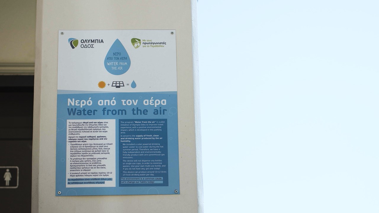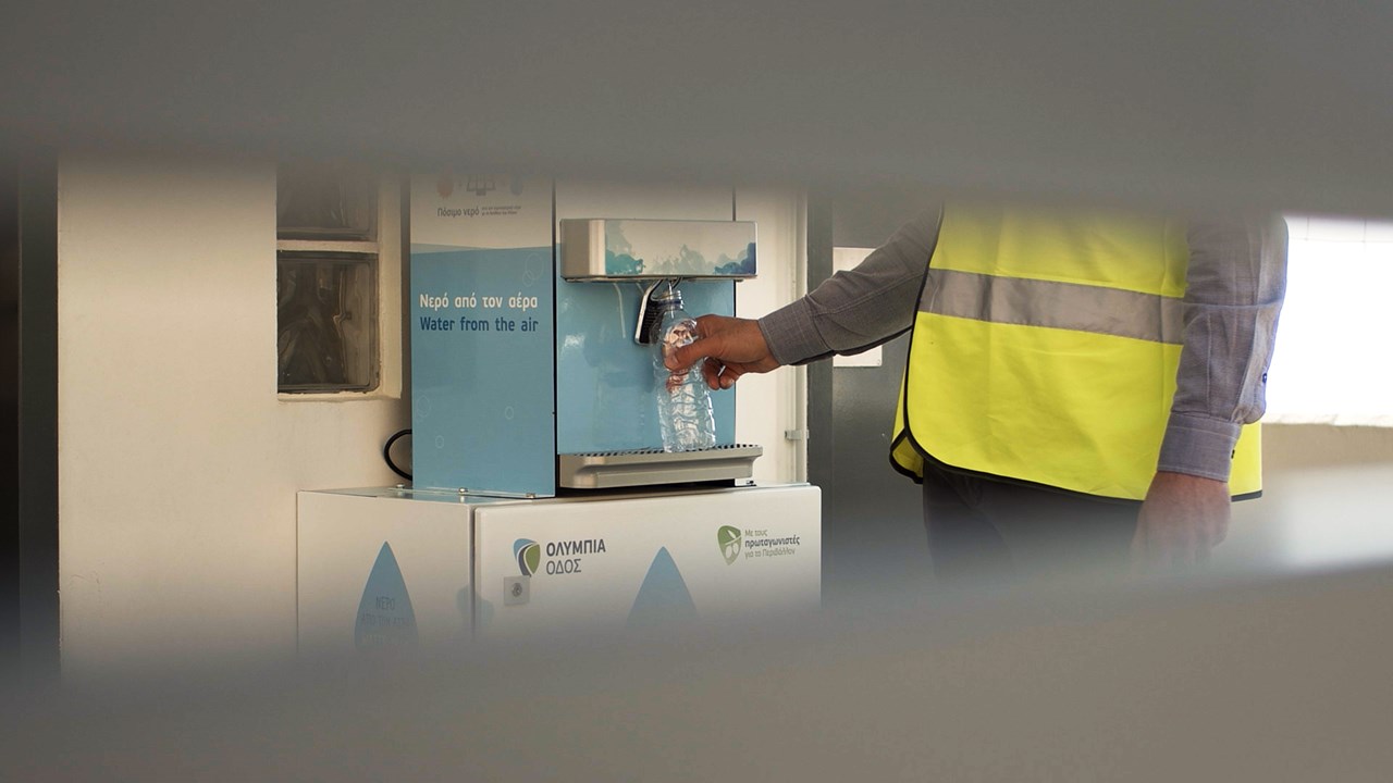 Στο πλαίσιο του προγράμματος “Water from the air” το νερό συλλέγεται από την υγρασία του αέρα, φιλτράρεται, εμπλουτίζεται με μεταλλικά στοιχεία και εξέρχεται φρέσκο και καθαρό. Το σύστημα διαθέτει και ψύκτη που λειτουργεί αποκλειστικά με ηλιακή ενέργεια, για το θερμό κλίμα του ελληνικού καλοκαιριού. Έχοντας μηδενικές εκπομπές διοξειδίου του άνθρακα, το σύστημα καταφέρνει να δημιουργήσει 12-13 λίτρα νερό καθημερινά ενώ, ετησίως, μειώνει κατά 11.000 τα πλαστικά μπουκάλια νερού που καταλήγουν στα σκουπίδια.