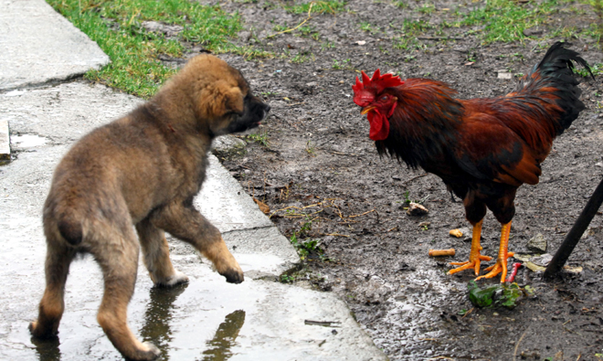 (Μικρός ποιμενικός σκύλος «τσακώνεται» με κόκορα μέσα σε αυλή σπιτιού στο Μεγαλοχώρι Τρικάλων)