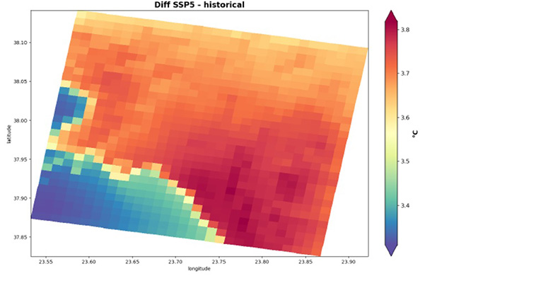 Παράλληλα, εκτιμήθηκε και η διαφορά θερμοκρασίας για τη χρονική περίοδο 2041-2070 σε σύγκριση με την περίοδο 1971 – 2000 με τη χρήση του σεναρίου SSP5-8.5 που εντάσσεται στη νέα σειρά σεναρίων των Ηνωμένων Εθνών για την Κλιματική Αλλαγή και είναι το δυσμενέστερο (ουσιαστικά θεωρεί ότι θα συνεχιστεί αμείωτη η χρήση των ορυκτών καυσίμων και κατά συνέπεια θα αυξηθεί περαιτέρω η συγκέντρωση των αερίων θερμοκηπίου, και ιδίως του διοξειδίου του άνθρακα, στην ατμόσφαιρα). Ειδικότερα, για την εκτίμηση, όπως εξηγεί ο κ. Καρτάλης, αξιοποιήθηκαν τρία κλιματικά μοντέλα τα αποτελέσματα των οποίων αποτυπώθηκαν σε βελτιωμένη χωρική κλίμακα της τάξης των 12.5 km x 12.5 km, με τη χρήση μηχανικής μάθησης και τη χρήση μιας σειράς προγνωστικών παραμέτρων όπως η μέση επιφανειακή ροή ηλιακής ακτινοβολίας, η ταχύτητα του ανέμου στα 10 μέτρα από την επιφάνεια, κ.α.