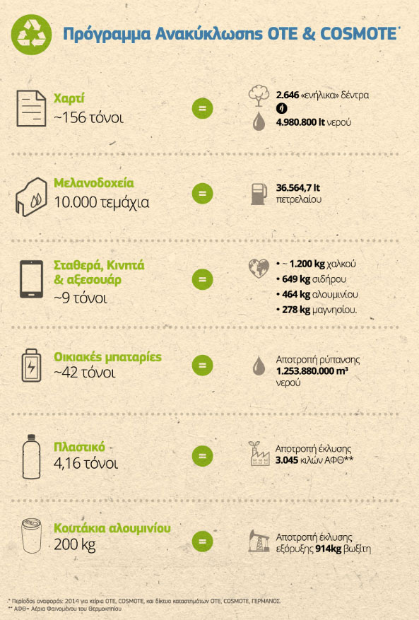 Περισσότεροι από 60 τόνοι ανακυκλώσιμων υλικών συγκεντρώθηκαν το 2014 στο πλαίσιο του προγράμματος ανακύκλωσης ΟΤΕ–COSMOTE, που υλοποιείται τόσο σε κτίρια όσο και στα καταστήματα του Ομίλου με τη συμμετοχή εργαζομένων και πελατών.
