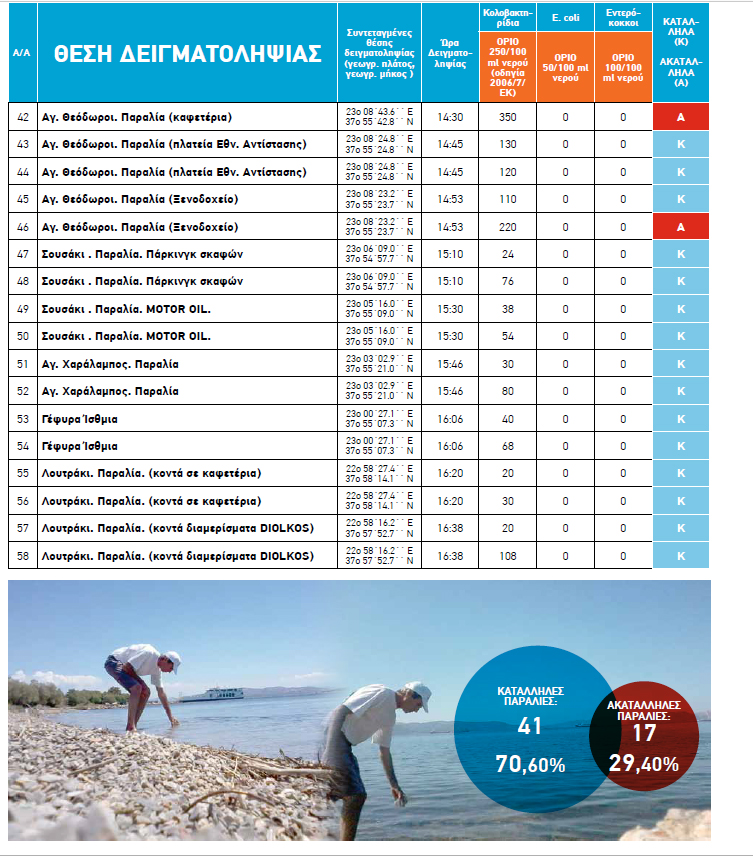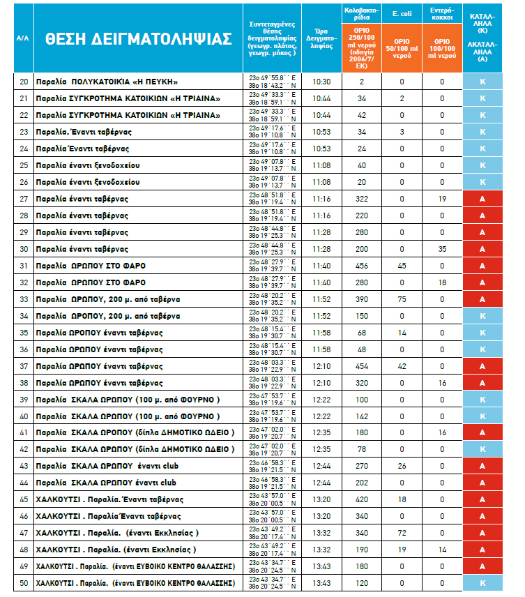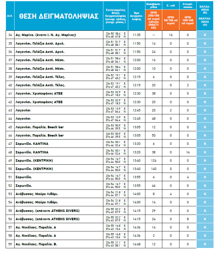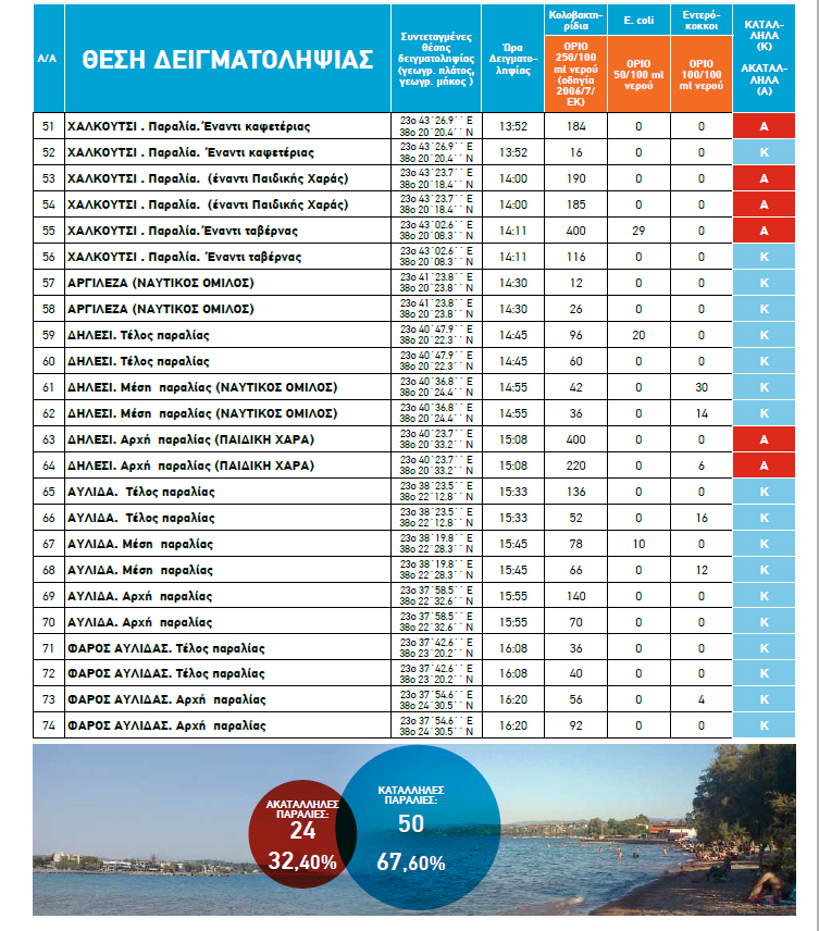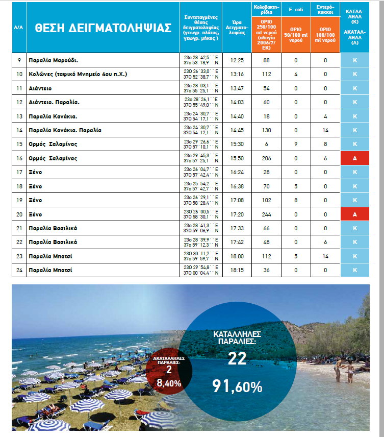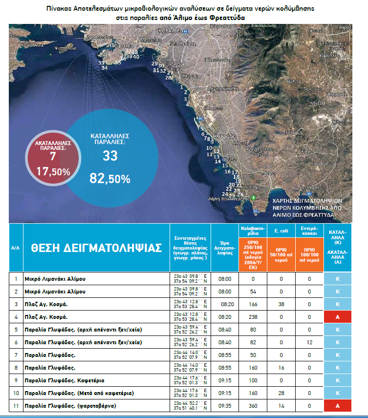 Το ΠAKOE προχώρησε και φέτος, για 39η χρονιά, στην πραγματοποίηση εκτεταμένων δειγματοληψιών σε 323 παραλίες. Με γνώμονα τα αποτελέσματα αυτών των μετρήσεων, έκανε μια κατανομή στις παραλίες χαρακτηρίζοντάς τες Κατάλληλες (Κ) για κολύμβηση και Ακατάλληλες (Α). Σύμφωνα με τα αποτελέσματα, 252 (78.2%) είναι κατάλληλες παράλιες για κολύμβηση και 71 (22%) είναι ακατάλληλες