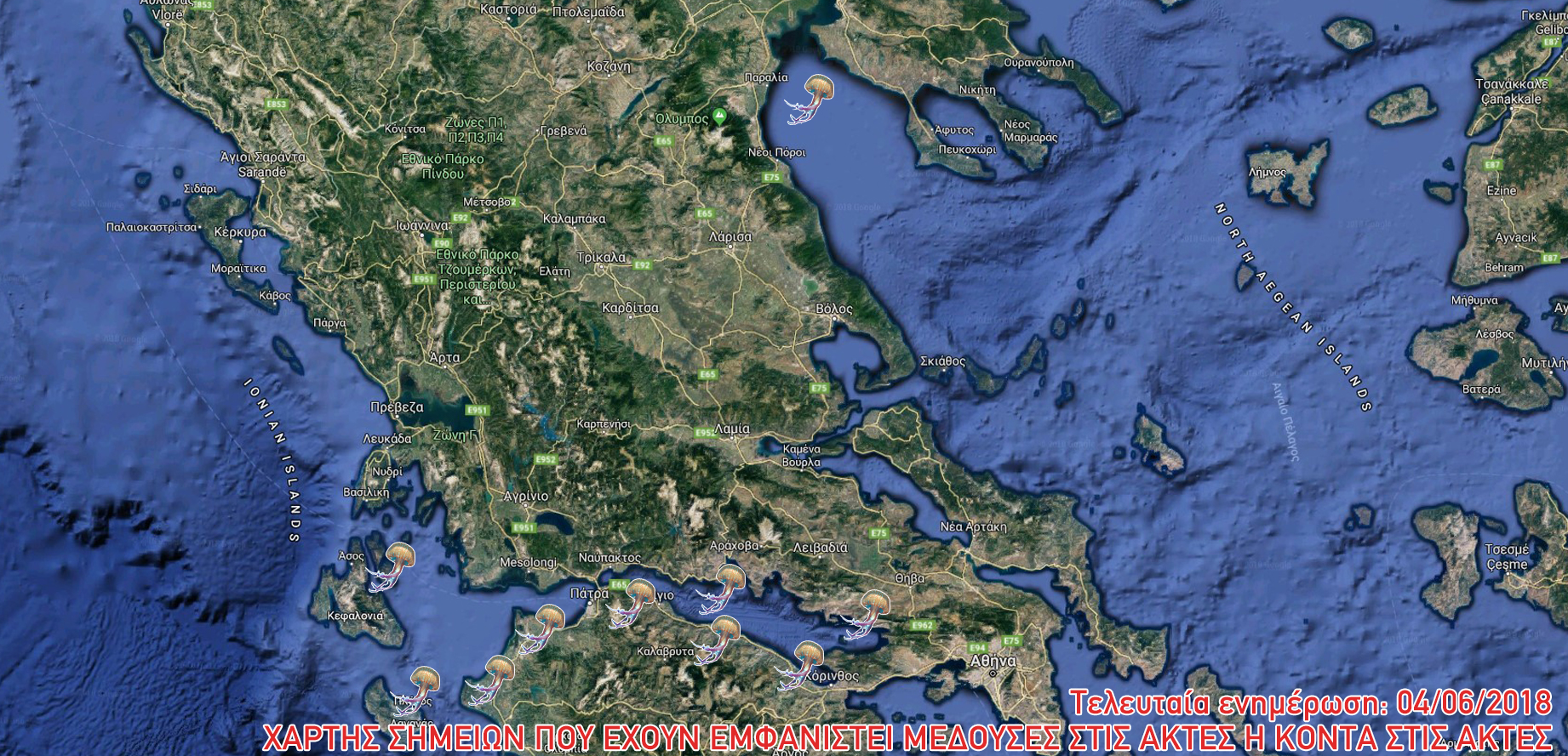 Δείτε στον παρακάτω χάρτη σε ποια σημεία μέχρι σήμερα υπάρχουν αναφορές για εμφάνιση μεδουσών στις ακτές ή κοντά στις ακτές.