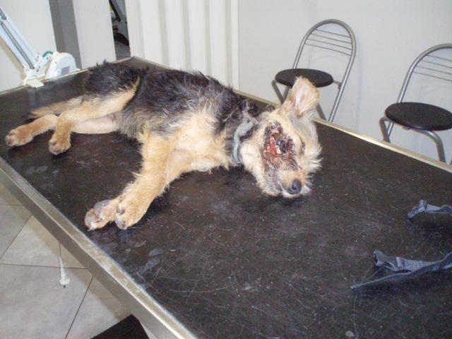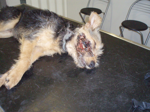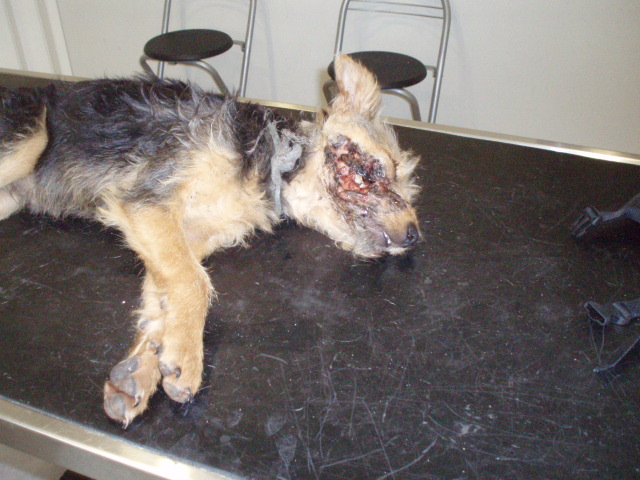 Το κουτάβι – που βλέπετε παραμορφωμένο σε αυτές τις φριχτές φωτογραφίες – ήταν μόλις έξι μηνών. Τι ζημιά θα μπορούσε να προκαλέσει αυτό το ζωάκι στο χωράφι του ανθρωπόμορφου κτήνους, που το πυροβόλησε στα μάτια, την περασμένη Πέμπτη 30 Δεκεμβρίου 2010; Το δύστυχο ζώο βρέθηκε πυροβολημένο σ’ ένα χωράφι στην Καλαμάτα, ευτυχώς το αδελφάκι του γλύτωσε από τον βέβαιο θάνατο.