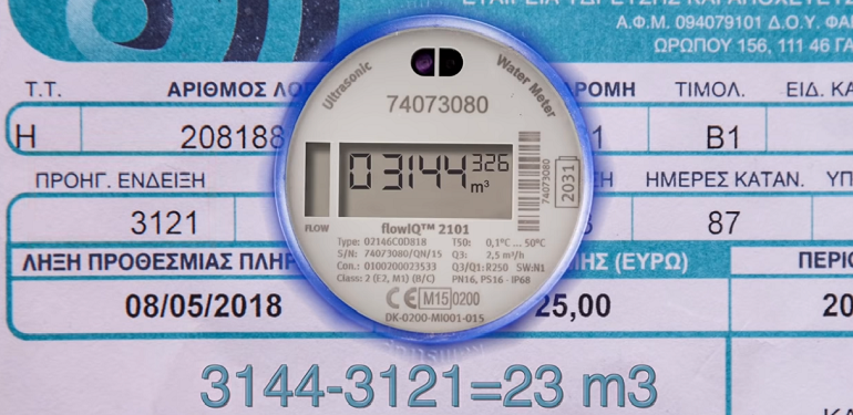 Αφαιρώντας την παλιά ένδειξη του λογαριασμού από τη νέα από απεικονίζει ο μετρητής, μαθαίνουμε την ποσότητα σε κυβικά μέτρα που καταναλώσαμε το διάστημα από την έκδοση του πιο πρόσφατου λογαριασμού μέχρι και τη στιγμή που ελέγχουμε τον μετρητή.