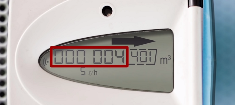 Ο δεύτερος τύπος είναι ο ηλεκτρονικός μετρητής. Και σε αυτή την περίπτωση, αγνοούμε τα τρία τελευταία ψηφία που καταγράφουν την κατανάλωση λίτρα και κοιτάμε τα 6 πρώτα, που απεικονίζουν την κατανάλωση σε κυβικά μέτρα. Το βέλος πάνω από τα ψηφία επιτελεί τον ρόλο του μαύρου δείκτη στον μετρητή ευθείας ανάγνωσης: Αν κινείται, τότε πραγματοποιείται κατανάλωση τη δεδομένη χρονική στιγμή.