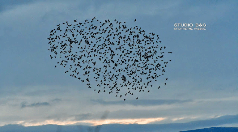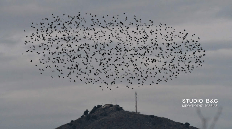 Ένα μεγάλο κοπάδι από ψαρόνια ξεδίπλωσε τις «χορευτικές» του ικανότητες πετώντας πάνω από την πόλη του Ναυπλίου την Τετάρτη 26 Δεκεμβρίου 2018.Το τσουχτερό κρύο του χειμώνα φέρνει τα ψαρόνια κοντά στις πόλεις. Πετάνε σε άψογους και εντυπωσιακούς σχηματισμούς κατά εκατοντάδες και προκαλούν τα βλέμματα των κατοίκων των πόλεων, αφού κατακλύζουν δέντρα, πάρκα και ταράτσες.