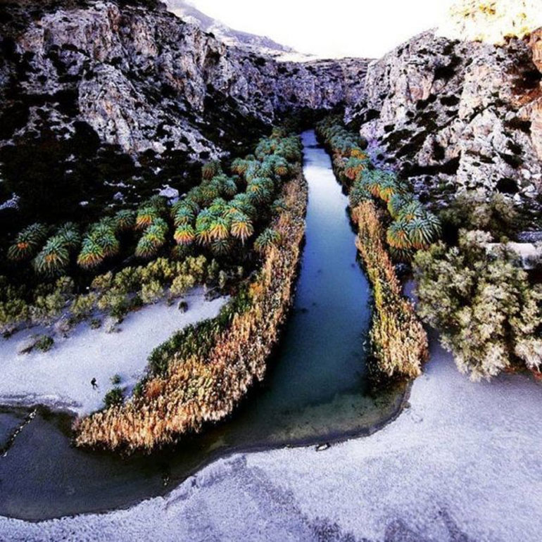 Τον γύρο του διαδικτύου έχει κάνει μία σπάνια εικόνα: Ο χιονιάς που πλήττει την Κρήτη έντυσε στα λευκά το φημισμένο Φοινικόδασος, στην Πρέβελη.