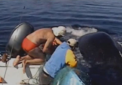 Οι τρεις άνδρες πλησίασαν με μια βάρκα κοντά της και αφού έκοψαν με ένα αιχμηρό αντικείμενο το δίχτυ, είδαν με ικανοποίηση τη φάλαινα να κάνει…το δικό της άλμα προς την ελευθερία.