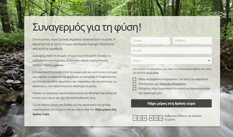 Περισσότερες από 100 οργανώσεις ενώνουν τη φωνή τους για να κινητοποιήσουν μέλη και υποστηρικτές τους, καθώς και το ευρύτερο κοινό, και να μεταφέρουν στην Ευρωπαϊκή Επιτροπή το μήνυμα ότι θέλουν η ευρωπαϊκή νομοθεσία για την προστασία της φύσης όχι μόνο να διατηρηθεί, αλλά να ενισχυθεί και κυρίως να εφαρμοστεί. Η διαδικτυακή δράση των περιβαλλοντικών οργανώσεων επιτρέπει στους πολίτες να συμμετάσχουν στη δημόσια διαβούλευση ως τις 24 Ιουλίου 2015 και αποτελεί τη μόνη ευκαιρία της κοινής γνώμης να εκφράσει την άποψή της σε αυτή την τεχνική αξιολόγηση.