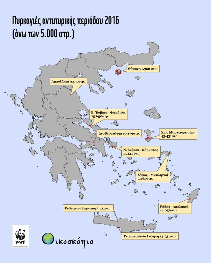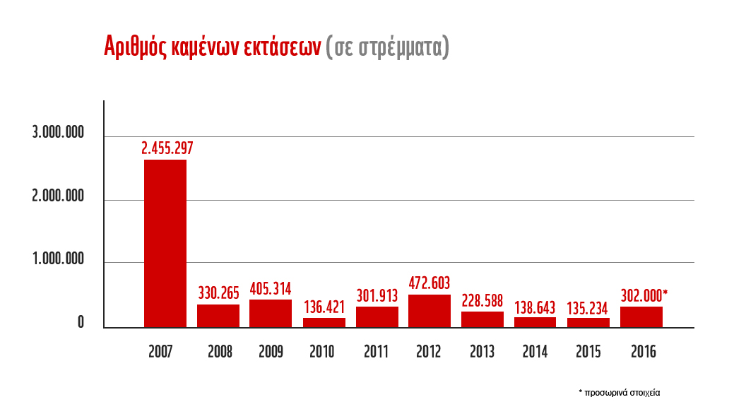 Ακόμα μια δύσκολη αντιπυρική περίοδος για τα δασικά οικοσυστήματα της χώρας μας πλησιάζει στο τέλος της. Σύμφωνα με τα μέχρι στιγμής δεδομένα του EFFIS (European Forest Fire Information System), περίπου 302.000 στρέμματα δασικής βλάστησης κάηκαν. Αυτό σημαίνει ότι το καλοκαίρι του 2016 βρίσκεται στην 5η θέση από πλευράς καμένων εκτάσεων για την τελευταία δεκαετία.