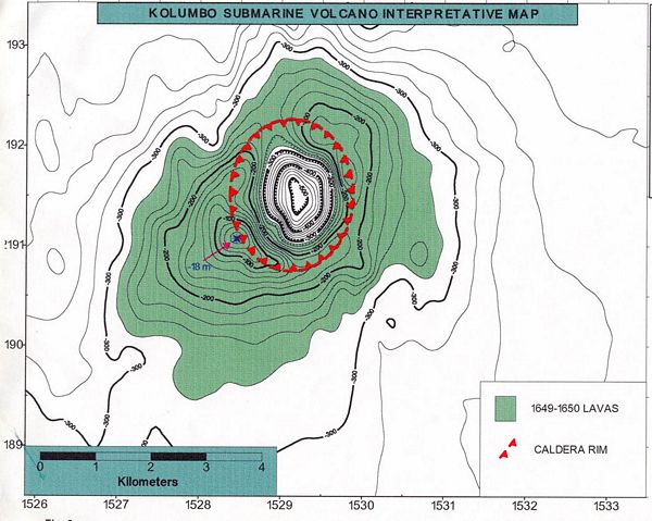 Το συγκεκριμένο ηφαίστειο, που βρίσκεται επτά χιλιόμετρα βορειοανατολικά της Σαντορίνης και σε βάθος 500 μέτρων, θεωρούμενο ένα από τα πιο ενεργά και επικίνδυνα της Μεσογείου, στέλνει βίαιες εκροές ρευστών και αερίων κάθε περίπου δύο λεπτά, πράγμα που αποτελεί την «ανάσα» του.