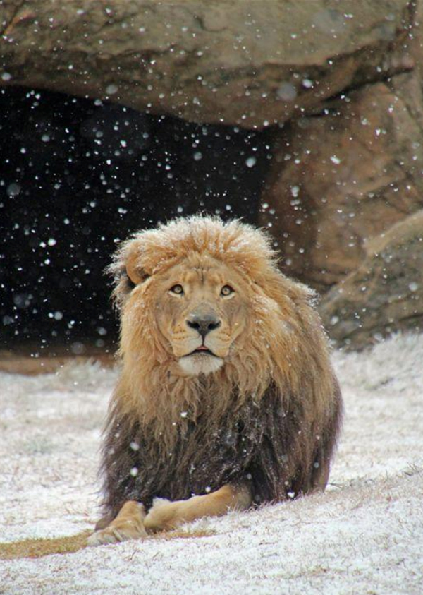 Στη φωτογραφία απεικονίζεται ένα λιοντάρι, περήφανο και αγέρωχο, να απολαμβάνει τις άσπρες νιφάδες χιονιού που πέφτουν πάνω του.