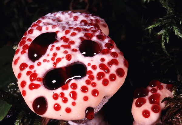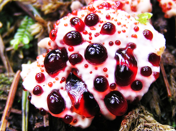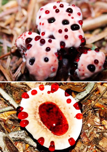 Σχεδόν εξ ολοκλήρου λευκό («καπέλο» και «πόδι»), το εντυπωσιακό αυτό μανιτάρι φέρει στην επιφάνειά του κατακόκκινες υγρές κηλίδες που μοιάζουν με αίμα, δίνοντας την εντύπωση στο θεατή ότι ο εν λόγω μύκητας αιμορραγεί από παντού.