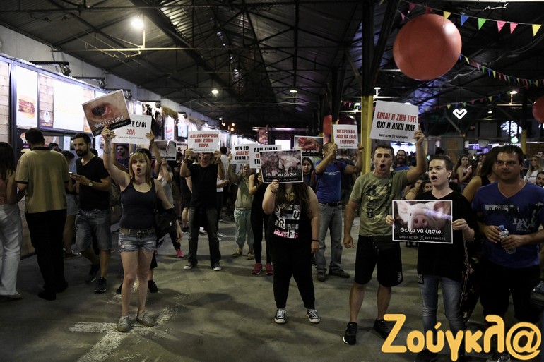 Ομάδα vegan ακτιβιστών πραγματοποίησαν δυναμική παρέμβαση στο Burger Festival, που πραγματοποιείται στο αμαξοστάσιο Ο.ΣΥ., στο Γκάζι. Θέλοντας να περάσουν το μήνυμα υπέρ της προάσπισης των δικαιωμάτων των ζώων, άνθρωποι που έχουν επιλέξει τον «ειρηνικό» – και αυστηρά μη κρεατοφαγικό- τρόπο ζωής, με ντουντούκες, συνθήματα, πανό, αλλά και πλακάτ με σκληρές εικόνες από σφαγές ζώων, πραγματοποίησαν τον δικό τους «αντίλογο» σε τέτοιου τύπου φεστιβάλ.