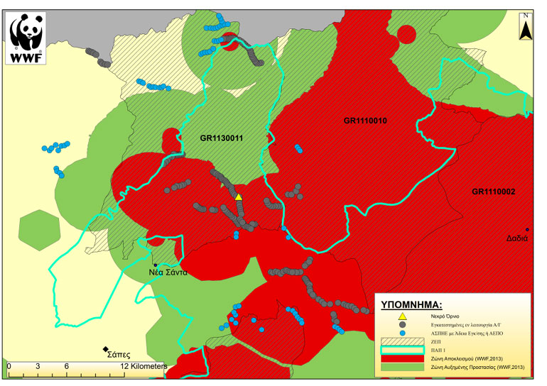To WWF Ελλάς εδώ και περισσότερο από μία δεκαετία μελετά τους κινδύνους που προκύπτουν για τα πουλιά ως αποτέλεσμα της εγκατάστασης αιολικών πάρκων στην περιοχή. Κατά την περίοδο 2008-2010 το WWF Ελλάς εκπόνησε την πρώτη συστηματική έρευνα στη χώρα για νεκρά ζώα από υφιστάμενα αιολικά πάρκα. Σύμφωνα με αυτή, και αν υλοποιηθούν όλες οι προβλέψεις του ειδικού χωροταξικού των ΑΠΕ αιολικών πάρκων, προβλέπεται ότι θα χαθούν 80 αρπακτικά τον χρόνο, από τα οποία τα 10 θα είναι γύπες. Ένας τέτοιος ρυθμός απώλειας θέτει σε κίνδυνο την ίδια την επιβίωση τους.