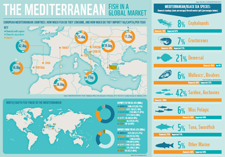 Για να κατανοήσει κανείς την κλίμακα του εμπορίου αρκεί να αναφέρουμε ότι τα μεσογειακά κράτη της ΕΕ καταναλώνουν σχεδόν 7,5 εκατομμύρια τόνους ψαρικών ετησίως. Παρόλα αυτά, εξ αυτών μόνο οι 2,75 εκατομμύρια τόνοι προέρχονται από εγχώριες πηγές. Αυτό σημαίνει ότι αφενός για να καλύψουμε τη ζήτηση, κάθε χρόνο αναζητούμε από άλλες χώρες 5 εκατομμύρια τόνους ψαρικών και αφετέρου, ότι ένα μεγάλο μέρος του πληθυσμού στις αναπτυσσόμενες χώρες κυρίως, εξαρτώνται από αυτήν την υψηλή ζήτηση ψαρικών στη Μεσόγειο. Σημειώνεται μάλιστα ότι τα μεσογειακά κράτη της ΕΕ απορροφούν το 36% όλων των ψαρικών που εισάγονται από τρίτες χώρες. Μεγάλο μέρος των εισαγωγών προέρχεται από τη Βόρεια Αφρική (Μαρόκο, Τυνησία, Αλγερία, Λιβύη), ενώ σημειώνεται ότι το 2014, τα μεσογειακά κράτη της ΕΕ εισήγαγαν περίπου 1,8 εκατομμύρια τόνους από αναπτυσσόμενες χώρες της περιοχής (Μαρόκο, Τυνησία, Αλγερία, Λιβύη, Μαυριτανία, Αίγυπτος και Τουρκία).