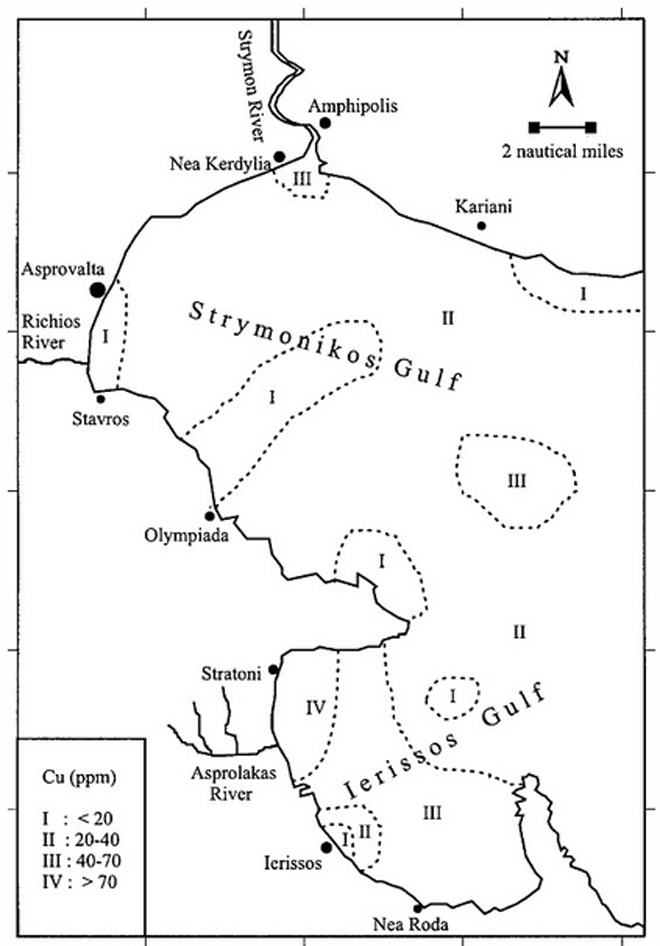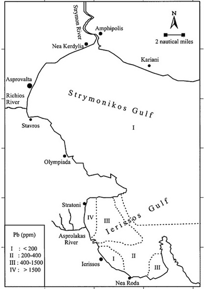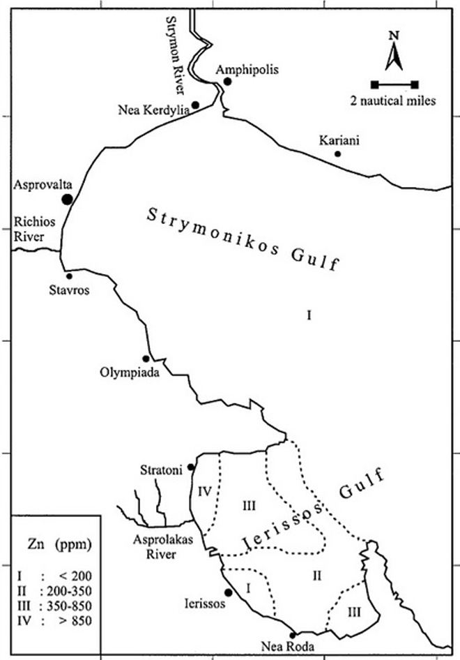 H περιοχή με την υψηλότερη ρύπανση από μόλυβδο, ψευδάργυρο και χαλκό είναι ο βυθός κοντά στις εγκαταστάσεις φόρτωσης της μεταλλευτικής δραστηριότητας (εργοστάσιο επίπλευσης) στον όρμο του Στρατωνίου. Συγκεκριμένα η βορειοδυτική πλευρά του κόλπου της Ιερισσού είναι ένα από τα πλέον ρυπασμένα σε μόλυβδο και ψευδάργυρο παράκτια οικοσυστήματα στην ανατολική Μεσόγειο. Το χρώμιο και το νικέλιο και στους δυο κόλπους είναι πιθανότατα το αποτέλεσμα της διαβρωτικής δράσης του ποταμού Στρυμόνα καθώς και άλλων μικρότερων ποταμών που εκβάλλουν σε αυτούς τους κόλπους. Το αποτέλεσμα της παρούσας μελέτης εμφανίζει υψηλότερες περιεκτικότητες χαλκού και ψευδαργύρου στον κόλπο της Ιερισσού σε σχέση με προηγούμενες μελέτες. Στον Στρυμονικό κόλπο η παρούσα μελέτη καταδεικνύει χαμηλότερες περιεκτικότητες χαλκού, μολύβδου, ψευδαργύρου και νικελίου από αυτές που μετρήθηκαν σε προηγούμενη μελέτη.