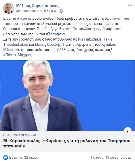 Σε ανακοίνωση του στο Facebook, ο Νεοδημοκράτης βουλευτής αναφέρει «Είναι το νερό δημόσιο αγαθό; Ποιοι κρύβονται πίσω από τη ρύπανση του ποταμού; Τι κάνουν οι ελεγκτικοί μηχανισμοί; Ποιος υπερασπίζεται το δημόσιο συμφέρον; Στο ίδιο έργο θεατές! Για πολλοστή φορά μάρτυρες μόλυνσης των νερών του Τιταρήσιου».
