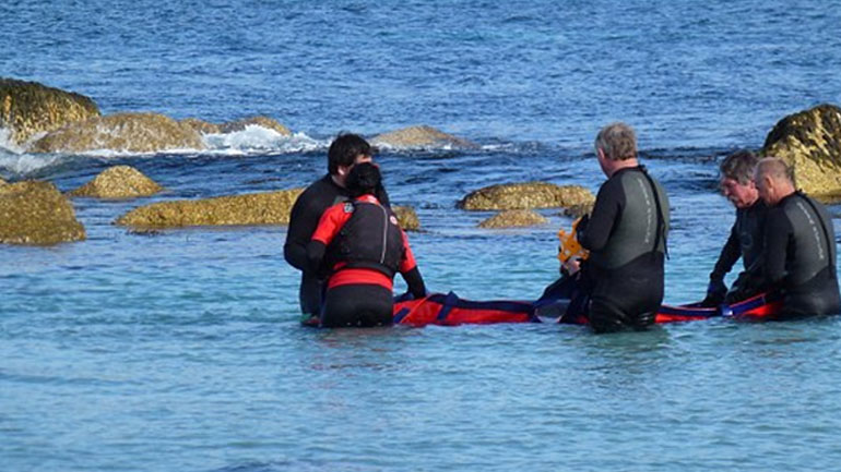 Οι δύο άντρες αντέδρασαν γρήγορα τυλίγοντάς την με μια πολύχρωμη πετσέτα θαλάσσης, και κάλεσαν τις Αρχές για να συνδράμουν στην «επιχείρηση» επιστροφής της στα νερά του Ωκεανού.