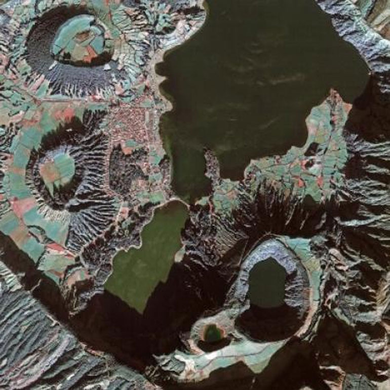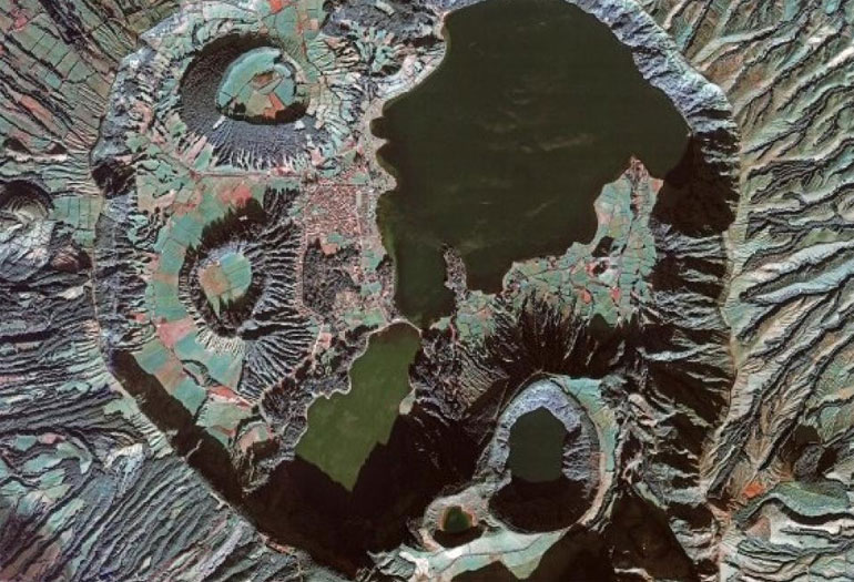 Αυτή η φωτογραφία είναι από το νησί των Αζορών του São Miguel και λήφθηκε από το διάστημα. Κοιτώντας πιο κοντά βλέπουμε το ηφαιστειακό σύμπλεγμα με πλάτος 5 χλμ. που ονομάζεται Sete Cidades Massif.
