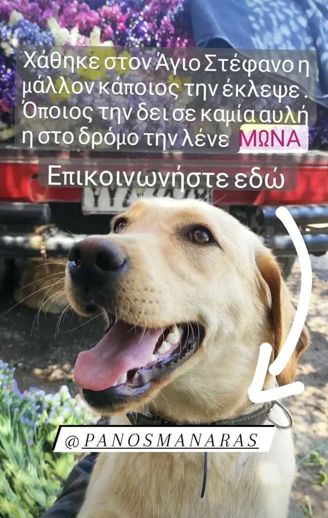 Το πρωί της Δευτέρας 16 Αυγούστου 2022 χάθηκε το εικονιζόμενο σκυλάκι, στον Άγιο Στέφανο. Την λένε Μώνα, είναι θηλυκό ημίαιμο λαμπραντόρ, ενός έτους. Είναι πολύ φιλική.